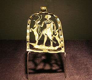 The first written evidence of deities in Egypt comes from the Early Dynastic Period (c. 3100–2686 BC).[13] Deities must have emerged sometime in the preceding Predynastic Period (before 3100 BC) and grown out of prehistoric religious beliefs. Predynastic artwork depicts a variety of animal and human figures. Some of these images, such as stars and cattle, are reminiscent of important features of Egyptian religion in later times, but in most cases there is not enough evidence to say whether the images are connected with deities. As Egyptian society grew more sophisticated, clearer signs of religious activity appeared.[14] The earliest known temples appeared in the last centuries of the predynastic era,[15] along with images that resemble the iconographies of known deities: the falcon that represents Horus and several other gods, the crossed arrows that stand for Neith,[16] and the enigmatic "Set animal" that represents Set.[17]