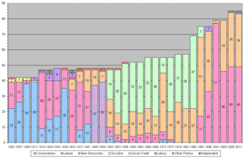 The number of seats has increased over time, from 25 for the first election in 1871, to the current 85.[4][5][6] Until the 1903 election, British Columbia politics were officially non-partisan – political parties were not part of the process.[7] This began to change in the 1898 and 1900 elections with the appearance of party-designated candidates, and federal political parties were recognized in the provincial election of 1903.[3] The first elections held along party lines (1903–41) were primarily contested by the Conservative Party (which won five elections during this period) and the Liberal Party (which won six elections). For two sessions during and immediately after World War II, the legislature was managed by a coalition government between the Conservatives and the Liberals. The Social Credit Party dominated elections from 1952–86, winning eleven of the twelve elections. Provincial politics since 1986 have been dominated by the New Democratic Party which won two elections in the 1990s, and by the Liberal Party which has won every provincial election since 2001.