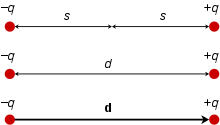 and is directed from the negative charge to the positive one. Some authors may split d in half and use s = d/2 since this quantity is the distance between either charge and the centre of the dipole, leading to a factor of two in the definition.