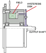 When electricity is applied to the field, it creates an internal magnetic flux. That flux is then transferred into a hysteresis disk passing through the field. The hysteresis disk is attached to the brake shaft. A magnetic drag on the hysteresis disk allows for a constant drag, or eventual stoppage of the output shaft.