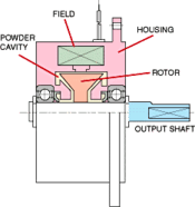 Magnetic particles (very similar to iron filings) are located in the powder cavity. When electricity is applied to the coil, the resulting magnetic flux tries to bind the particles together, almost like a magnetic particle slush. As the electric current is increased, the binding of the particles becomes stronger. The brake rotor passes through these bound particles. The output of the housing is rigidly attached to some portion of the machine. As the particles start to bind together, a resistant force is created on the rotor, slowing, and eventually stopping the output shaft.