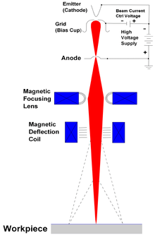 The basic components of a typical electron beam processing device are illustrated in the figure.[1] An electron gun (consisting of a cathode, grid, and anode) is used to generate and accelerate the primary beam. A magnetic optical (focusing and deflection) system is used for controlling the way in which the electron beam impinges on the material being processed (the "workpiece"). In operation, the gun cathode is the source of thermally-emitted electrons that are both accelerated and shaped into a collimated beam by the electrostatic field geometry established by the gun electrode (grid and anode) configuration used. The electron beam then emerges from the gun assembly through an exit hole in the ground-plane anode with an energy equal to the value of the negative high voltage (gun operating voltage) being applied to the cathode. This use of a direct high voltage to produce a high energy electron beam allows the conversion of input ac power to beam power at greater than 95% efficiency, making electron beam material processing a highly energy-efficient technique. After exiting the gun, the beam passes through an electromagnetic lens and deflection coil system. The lens is used for producing either a focused or defocused beam spot on the workpiece, while the deflection coil is used to either position the beam spot on a stationary location or provide some form of oscillatory motion.