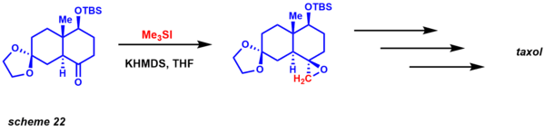 Based on their reactivity, another distinct advantage of these two variants is that kinetically they provide a difference in diastereoselectivity. The reaction is very well established, and enantioselective variants (catalytic and stoichiometric) have also been achieved. From a retrosynthetic analysis standpoint, this reaction provides a reasonable alternative to conventional epoxidation reactions with alkenes (scheme 22). Danishefsky utilized this methodology for the synthesis of taxol. Diastereoselectivity is established by 1,3 interactions in the transition state required for epoxide closure.[52]