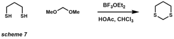The pKa of dithianes is approximately 30, allowing deprotonation with an alkyl lithium reagent, typically n-butyllithium. The reaction with dithianes and aldehydes is now known as the Corey-Seebach reaction. The dithiane once deprotonated serves as an acyl anion used to attack incoming electrophiles. After deprotection of the dithiane, usually with HgO, a ketone product is observed from the masked acyl dithiane anion. The utility of such reactions has expanded the field of organic synthesis by allowing synthetic chemists to use Umpolung disconnections in total synthesis (scheme 8).[26] 1,3-dithianes are also used as protecting groups for carbonyl compounds expressing the versatility and utility of this functional group.