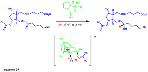 - ↑ Corey, E. J.; et al. (1998). "Reduction of Carbonyl Compounds with Chiral Oxazaborolidine Catalysts: A New Paradigm for Enantioselective Catalysis and a Powerful New Synthetic Method". Angew. Chem. Int. Ed. 37 (15): 1986–2012. doi:10.1002/(sici)1521-3773(19980817)37:15<1986::aid-anie1986>3.0.co;2-z.
