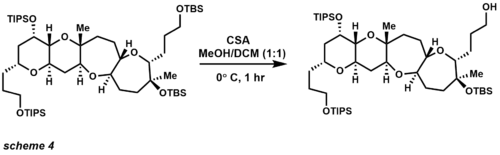In the field of complex molecule synthesis, TBS has been widely used as one of the most versatile of the silicon-based protecting groups (scheme 4).[19][20] The use of CSA provides selective removal of a primary TBS ether in the presence of tertiary TBS ether and TIPS ethers. Other means of TBS deprotection include acids (also Lewis acids), and fluorides. TIPS protecting groups were also pioneered by Corey and provide increased selectivity of primary alcohol protection over secondary and tertiary alcohol protection. TIPS ethers are more stable under acidic and basic conditions, the disadvantage of this protecting group over TBS ethers being that the group is less labile for deprotection.[21] The most common reagents used for cleavage employ the same conditions as TBS ether, but longer reaction times are generally needed.