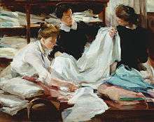 Her painting Shop Girls c.1912 was exhibited at the Art Institute of Chicago as part of an intention to pick "eye-popping" or "little masterpieces of compactness and stimulation" from American artist's works of the late 19th century and early 20th-century.[32] Now in the Art Institute's collection,[33] Shop Girls was the first woman's painting bought by the Friends of America Art of the Art Institute. It was purchased in 1913 from Sparhawk-Jones for $550. Women's paintings were not generally as revered as paintings by men, which could fetch several thousands of dollars per painting at that time.[34][23] The painting was made into a poster in the 1980s by the New York Department of Labor,[35] which had the following quotation:
