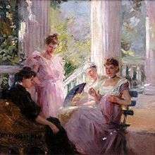 Sparhawk-Jones was supporting herself through the sales of her oil and watercolor paintings by the time she was eighteen. She painted scenes of women reading or shopping as well as mothers and children walking through a park.[25] Her Impressionist works, known for their vivid colors, were exhibited internationally in 1908,[8] like the Carnegie Institute's international exhibition where she was the only woman to win anything and the only artist from the United States to receive an honorable mention.[2] That year, The New York Times called her "the find of the year",[8][2] having found her painting The Porch to be the "most unforgettable canvas" in the exhibition that they reviewed. Her use of color and expressive brush strokes were compared by art critics to William Merritt Chase's style.[2]