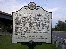 In 1690 the town and seaport of Elkridge Landing was settled in the Patapsco Valley of the Colony of Maryland.[nb 1] It was a deep-water port, with a channel about 10 feet deep, that brought ships inland from the Chesapeake Bay. Tobacco casks, or hogsheads, were rolled down Rolling Hill to the port by "long strings of slaves" and boarded ships. Manufactured iron was also shipped out of the port.[3][4]