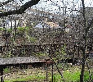 The station opened on February 23, 1886 as a surface station.[4][5] In the early 1930s as part of a grade crossing elimination project, the station was depressed into the current open-cut below grade level, and rebuilt with concrete platforms.[2][4][5][6][7] The platforms are slightly offset due to the right-of-way crossing at a diagonal with the streets in the neighborhood;[1][5] each measures about 240 feet (73 m) in length, which would fit three cars of the former ME-1 rolling stock (67 feet in length) or of the current R44 SIR cars (75 feet in length).[1] Exit stairs were located at the west end of the station towards Morningstar Road. An overpass from Eaton Place to Newark Avenue over the line (not connected to the station) was located at the station's east end under the Bayonne Bridge.[5] East of the station past John Street, the line rises onto a concrete trestle built in 1935.[2][4][5][7][8] Elm Park was closed on March 31, 1953, along with the South Beach Branch and the rest of the North Shore Branch.[4][5]