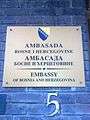 Plaque outside the embassy in Bosnian, English and Serbian depicting the Coat of arms of Bosnia and Herzegovina