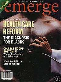Emerge was a monthly news magazine that was published from 1989[1][2] to 2000. Its primary focus was on issues of interest to African Americans. In 2000, Time said Emerge was "the nation's best black newsmagazine for the past seven years"[3] the St. Louis Post-Dispatch described it as "the premier source for intellectual discussion on issues affecting African-Americans",[4] and the New York Amsterdam News wrote that "it had no rival for cutting edge news for and about the Black community".[5] The magazine was headquartered in Washington, D.C.[6]