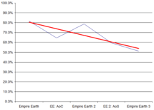Empire Earth, the first in the series, was well received by the critics, averaging an 82% overall.[7] Empire Earth II did not do as well as its predecessor, with only a 79% average.[8] The expansion packs were given mediocre reviews at best, with Conquest averaging 66% and Supremacy averaging 61%.[9][10] Empires: Dawn of the Modern World had a closer rating to Empire Earth than anything else in the series, with an 81% average.[11] Empire Earth mobile averaged about 77%.[12] Empire Earth III was the worst received title of the series averaging only a 50% overall.[13]