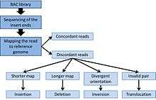 Inversions and translocations are relatively easy to detect by an invalid pair of sequenced-end. For instance, a translocation can be detected if the paired-ends are mapped onto different chromosomes on the reference genome.[4][5] Inversion can be detected by divergent orientation of the reads, where the insert will have two plus-end or two minus-end.