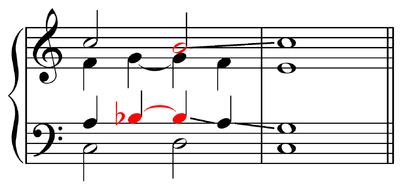 For instance, observe beat 4 of the example shown at right: the tenor's G♮ sounds concurrently with the soprano's G♯. This voice leading entails the seventh degree's dual functionality, or its capacity for opposing voice-leading tendencies. That is, a lowered seventh degree resolves downward to the sixth (e.g., G–F), while a raised seventh (i.e., a leading tone) resolves upward to the first degree (e.g., G♯–A).