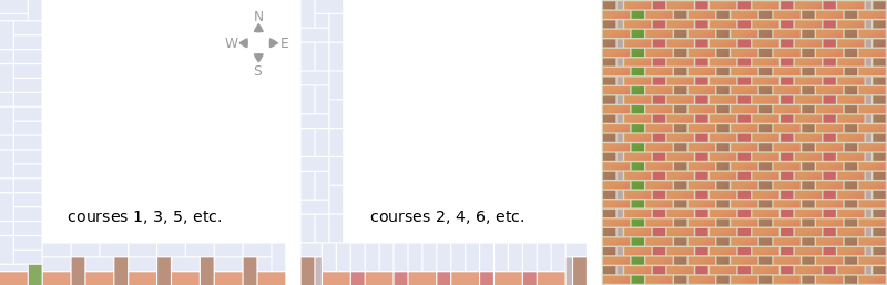 This bond also has alternating stretching and heading courses. However, whilst the heading courses are identical with those found in the standard English bond, the stretching courses alternate between a course composed entirely of stretchers, and a course composed of stretchers half off-set relative to the stretchers two courses above or below, by reason of a header placed just before the quoins at either end.[43][44] The bond is widely found in Northern France, Belgium and the Netherlands.[45]