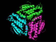 The enzymes of the hydratase/isomerase or crotonase superfamily are typically trimeric disks dimerized into hexamers. The wide range of their substrate-enzyme specificity derives from the variations in the distances between the trimeric disks and their orientation.[20] However, the human mitochondrial enoyl-CoA isomerase is a trimer and orients the fatty acid tail in a completely different direction from that seen in the hexamers.[8] The trimeric disk of peroxisomal enzymes in Saccharomyces cerevisiae is displayed in Figure 3.[20]
