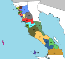 Territorially massive Ensenada municipality is administratively subdivided into 23 boroughs (Spanish: delegaciones), of which Ensenada form the city of Ensenada, the municipal seat: