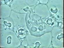 It is found in the mouth[5] inside the gingival pocket biofilm near the base of the teeth, and in periodontal pockets.[1] Entamoeba gingivalis is found in 95% of people with gum disease and rarely in people with healthy gums.[6][7] Cyst formation is not present; therefore transmission is direct from one person to another by kissing, or by sharing eating utensils. Only the trophozoites are formed and the size is usually 20 micrometers to 150 micrometers in diameter. Entamoeba gingivalis have pseudopodia that allow them to move quickly and phagocytise the nucleus of polynuclear neutrophils by exonucleophagy in periodontal disease.[8] Their spheroid nucleus is 2 micrometers to 4 micrometers in diameter and contains a small central endosome. There are numerous food vacuoles, which consists mostly of phagocitised PMN nucleus, blood cells and bacteria.