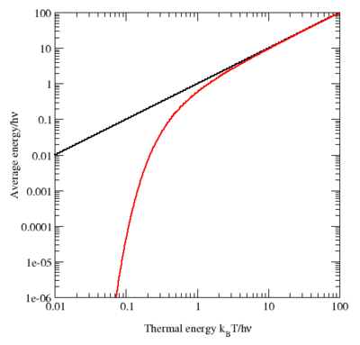 Figure 10. Log–log plot of the average energy of a quantum mechanical oscillator (shown in red) as a function of temperature. For comparison, the value predicted by the equipartition theorem is shown in black. At high temperatures, the two agree nearly perfectly, but at low temperatures when kBT << hν, the quantum mechanical value decreases much more rapidly. This resolves the problem of the ultraviolet catastrophe: for a given temperature, the energy in the high-frequency modes (where hν >> kBT) is almost zero.