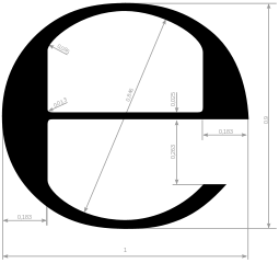 The mark looks like a stylised lower-case "e" and its shape, ℮, is precisely defined by an EU directive. It must be placed in the same field of vision as the nominal quantity. The sign has been added to the Unicode list of characters at position U+212E.