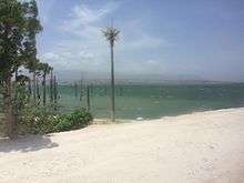 The lake has a length, from northwest to southeast, of 22 kilometres (14 mi); its maximum width is 12 kilometres (7.5 mi). The total area is 170 km2 (66 sq mi).[2] The lake water has an elevation of 15 metres (49 ft) with maximum water depth being 30 metres (98 ft). A sandy shore, shallow lagoons and mudflats form the eastern shore line, while the western shores have small fresh water springs and marshes. The eastern shore is state-owned, but parts of the western side of the lake are privately owned. Salinity of the lake water is now reported as 15‰ (parts per thousand). Lake water fluctuations are minimal, at about 50 centimetres (20 in), except during the drought period, when the water level could go down by 2 metres (6.6 ft). Conversely, the water level rises about 2 metres (6.6 ft) above the average during heavy rainfall years.[4] However, it was once inferred that Azuéi’s level in Haiti and the Enriquillo lake level in the adjoining Dominican Republic had registered a drop, since Columbus had visited the area more than 500 years ago. The present assessment is that the level of the lake has been rising in recent years, forcing Haitians who live in plantation residential areas ("bateyes") around the edge of the lake to seek higher ground.[5]