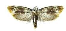 The length of the forewings is about 10.3 mm for males and 11.5–12.5 mm for females. The ground color of the forewings is white with several dark spots in the costal half, two dark spots of similar size at the base of the posterior half, as well as a light brown band from the base of the costa. The base of the costa is dark, split by a white spot and there is a large reddish spot surrounded by brown from the grey costal band to the posterior margin. The termen is reddish, golden apically to above the termen and there are two large spots in the white subterminal area. The hindwing ground colour is brownish with an ochreus termen.