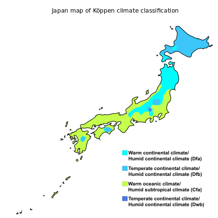 The climate of Japan is predominantly temperate, but varies greatly from north to south. Japan's geographical features divide it into six principal climatic zones: Hokkaido, Sea of Japan, Central Highland, Seto Inland Sea, Pacific Ocean, and Ryukyu Islands. The northernmost zone, Hokkaido, has a humid continental climate with long, cold winters and very warm to cool summers. Precipitation is not heavy, but the islands usually develop deep snowbanks in the winter.[67]