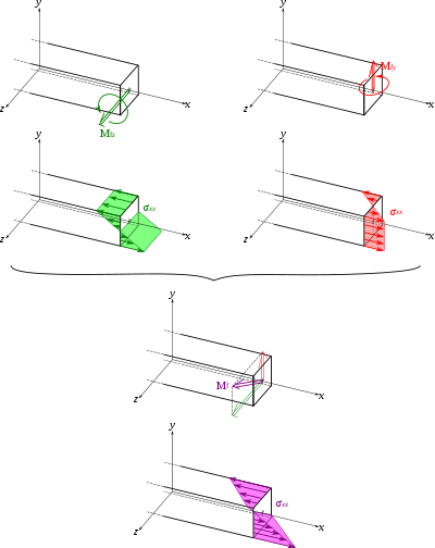 Here, is the distance from the neutral axis to a point of interest; and is the bending moment. Note that this equation implies that pure bending (of positive sign) will cause zero stress at the neutral axis, positive (tensile) stress at the "top" of the beam, and negative (compressive) stress at the bottom of the beam; and also implies that the maximum stress will be at the top surface and the minimum at the bottom. This bending stress may be superimposed with axially applied stresses, which will cause a shift in the neutral (zero stress) axis.