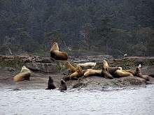 Reproductively mature male sea lions aggregate in May on traditional, well-defined reproductive rookeries,[15][16] usually on beaches on isolated islands. The larger, older males establish and defend distinct territories on the rookery.[15][16] A week or so later, adult females arrive, accompanied occasionally by sexually immature offspring, and form fluid aggregations throughout the rookery. Like all other otariids, Steller sea lions are polygynous. However, unlike some other species, they do not coerce individual females into harems, but control spatial territories among which females freely move about.[15] Steller sea lions have used aquatic, semiaquatic, and terrestrial territories. Males with semiaquatic territories have the most success in defending them.[16] The boundaries are defined by natural features, such as rocks, faults, or ridges in rocks, and territories can remain stable for 60 days.[15]