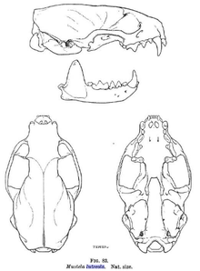 Fossil finds of the European mink are very rare, thus indicating the species is either a relative newcomer to Europe, probably having originated in North America,[8] or a recent speciation caused by hybridization. It likely first arose in the Middle Pleistocene, with several fossils in Europe dated to the Late Pleistocene being found in caves and some suggesting early exploitation by humans. Genetic analyses indicate, rather than being closely related to the American mink, the European mink's closest relative is the European polecat (perhaps due to past hybridization)[3] and the Siberian weasel,[4] being intermediate in form between true polecats and other members of the genus. The closeness between the mink and polecat is emphasized because the species can hybridize.[9][10][11]