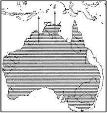 The spotted nightjar occurs across most of mainland Australia, although it is generally absent east and south of the Great Dividing Range along the eastern seaboard from central Queensland to southeast South Australia and does not occur in Tasmania. Individuals may be locally nomadic or sedentary in northern regions, while southern birds are partially sedentary or migratory, wintering in northern Australia from May to September. The species may also winter on Indonesian islands in the Banda Sea, possibly for some individuals as a result of overshooting, with vagrants recorded as far north as Irian Jaya.[2]