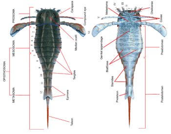 The prosoma is the forward part of the body, it is actually composed of six segments fused together to form the head and the thorax.[15] It contains the semicircular to subrectangular platelike carapace. On the dorsal side of the latter are two large crescent-shaped compound eyes.[16] They also possessed two smaller light-sensitive simple eyes (the median ocelli) near the center of the carapace on a small elevation (known as the ocellar mound).[17] Underneath the carapace is the mouth and six appendages, usually referred to in Roman numerals I-VI. Each appendage in turn is composed of nine segments (known as podomeres) labeled in Arabic numerals 1-9. The first segments which connect the appendages to the body are known as the coxa (plural coxae).[17]
