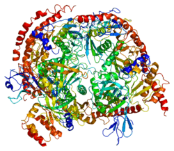 - ↑ Raijmakers R, Egberts WV, van Venrooij WJ, Pruijn GJ (2002). "Protein-protein interactions between human exosome components support the assembly of RNase PH-type subunits into a six-membered PNPase-like ring". J. Mol. Biol. 323 (4): 653–63. doi:10.1016/S0022-2836(02)00947-6. PMID 12419256.