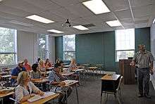 Factory model classrooms emerged in parallel with factory model education in the 19th century. These were designed around a lecture-style format of teaching, also known as direct instruction, with the teacher standing at the front of the classroom with the students seated in rows of desks, often fixed to the floor.[6][7][10] Factory model classrooms tend to be of a similar size and configuration, 800-900 square feet, with approximately 28-35 students of about the same age.[4] As single-room schools became larger, this model was replicated, with the classrooms created as a series of boxes, often along a long double-loaded corridor (with classrooms on each side).[11] This is a common feature of the most common organizational model, the departmental model, and also became known as "cells and bells".[12]