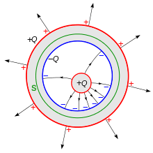 Another way to see that the enclosed charge induces an equal charge in the container is to use the visualization device of electric field lines.[11] Electric field lines terminate on equal charges; that is each line begins on a specific quantity of positive charge, and ends on an equal quantity of negative charge.[7] An additional fact needed is that electric field lines cannot penetrate conductors; if an electric field line penetrated into a volume of metal, the electrons in the metal would flow along the field line, redistributing the charge in the conductor until no electric field was left. Only when the electric field in the conductor is zero can the charges in the conductor be at electrostatic equilibrium.
