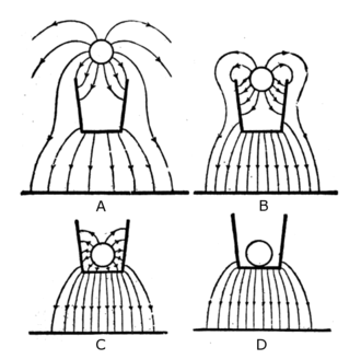 Strictly speaking, for the induced charge on the container to exactly equal the charge on the object, the metal container must completely enclose the charged object, without a hole.[12] If there is an opening, some of the electric field lines from C will pass through the opening, and therefore will not induce an opposite charge on the container, so the charge on the container's surfaces will be less than the charge on C. But an opening is necessary to get the charged object in and out. In his experiment, Faraday closed the opening by attaching the metal lid of the pail to the thread suspending the ball, so when the ball was lowered to the center of the container the lid covered the opening.[1][3] However this is not necessary. The experiment works very well even for containers with large uncovered openings, like Faraday's pail. As long as it is deep enough, and the depth of C inside the container is greater than the diameter of the opening,[12] the induced charge will be very close in value to the charge on C. As the drawing above shows, once the charged object is well inside, most of the electric field lines originating on the charge C end on the container walls, so very few of them pass through the opening to end on negative charges that are not located on the container. John Ambrose Fleming, a prominent early electrical researcher, wrote in 1911:[3]