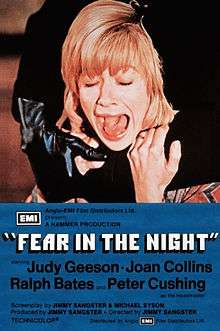 Fear in the Night (also known as Dynasty of Fear and Honeymoon of Fear[2]) is a 1972 British psychological horror film directed, produced, and co-written by Jimmy Sangster and produced by Hammer Film Productions. The film stars Judy Geeson as a psychologically-fragile woman who finds herself being tormented by a mysterious figure with a prosthetic arm upon relocating to a rural boarding school where her husband has taken a job. Peter Cushing and Joan Collins, respectively, also star as the school's mysterious headmaster and his wife.