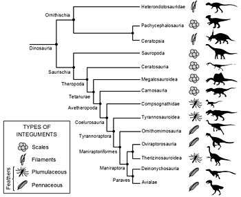 - Note that the filamentous structures in some ornithischian dinosaurs (Psittacosaurus, Tianyulong and Kulindadromeus) and the pycnofibres found in some pterosaurs may or may not be homologous with the feathers of theropods.[45][62]
