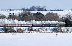 The snow provided an almost continuous photographic backdrop for the historic 250 mile run of the brand new steam locomotive No. 60163 Tornado hauling The Talisman from Darlington to London on 7 February. It is seen here passing through Hertfordshire