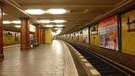 The U3 section was opened on 12 October 1913 as one of the line's original stations, the U7 section on 29 January 1971 with the line's extension from Möckernbrücke. Though the station has then been widely rebuilt including the new entrance hall in a - disputed - 1970s "oil rig" style, the U3 platform is preserved in its original condition. For more than seven years Fehrbelliner Platz was the western terminus of the U7, until its continuation toward Richard-Wagner-Platz on 28 April 1978.[1]