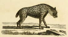 Bosman and Kolben's descriptions went largely unnoticed until 1771, when the Welsh naturalist Thomas Pennant, in his Synopsis of Quadrupeds, used the descriptions, as well as his personal experience with a captive specimen, as a basis for consistently differentiating the spotted hyena from the striped. The description given by Pennant was precise enough to be included by Johann Erxleben in his Systema regni animalis by simply translating Pennant's text into Latin. Crocuta was finally recognised as a separate genus from Hyaena in 1828.[25]