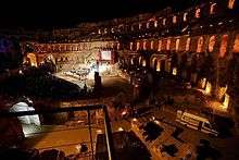 The Festival international de musique symphonique d'El Jem (Arabic: المهرجان الدولي للموسيقى السمفونية بالجم) is a symphonic music festival held every summer in the Tunisian town of El Jem since 1985. It is held in the El Jem amphitheater,[1] built in the third century, with a capacity between 27,000 and 30,000 spectators. Since its inception, the festival has attracted many orchestras who come here to give performances, including the Algerian National Symphony Orchestra, the Rome Philharmonic Orchestra, the Tunisian Symphony Orchestra, the Budapest Gypsy Symphony Orchestra for the first time in Africa, and the Orchestra Sinfonica di Roma led by Francesco La Vecchia.