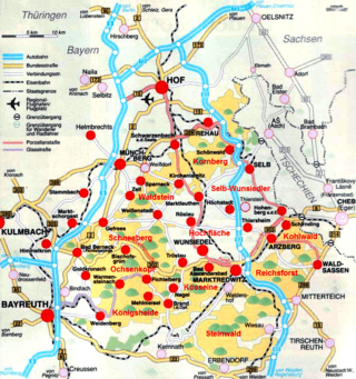 The county town in the heart of the Fichtel is Wunsiedel with its famous rock labyrinth. Other main settlements are Marktredwitz, Marktleuthen, Arzberg, Röslau, Weißenstadt, Waldershof, Kirchenlamitz and Tröstau (all on the upper reaches of the Eger and the Röslau), Further to the southeast and south are Bischofsgrün, Fichtelberg, Mehlmeisel, Nagel, Neusorg, Speichersdorf, Kemnath, Erbendorf, Wiesau and Fuchsmühl, in the west are Weidenberg, Creußen, Bayreuth, Goldkronach, Bindlach and Bad Berneck, in the northwest are Gefrees, Zell im Fichtelgebirge, Weißdorf, Münchberg (Obere Saale), and in the north Selb, Rehau and Hof.