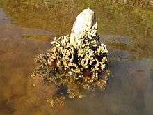 On the coast of South Africa, Australian tubeworms have been observed growing on the aquatic plant Potamogeton pectinatus.[12] In Argentina, the larvae settle on shells such as those of the sea snail Adelomelon brasiliana and the clams Mactra isabelleana and Tagelus plebeius.[7] In the Black Sea the reefs are associated with barnacles of the genus Balanus, caridean shrimp of the genus Palaemon, mud crabs of the genus Xantho, amphipods of the genus Orchestia, and isopods of the genus Sphaeroma.[13] Some tubeworm reefs also have colonies of bryozoans built into them.[11]