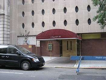 The stone-clad building was designed by Percival Goodman, an architect who described himself as "an agnostic who was converted by Hitler." Goodman sought to interpret Jewish tradition in modern ways in the more than 50 synagogues he designed.[5] Herman Wouk described Goodman's design as a "traditional Sephardic layout" with the bimah and aron in the center area facing rows of seats, thereby taking advantage of the depth of the property.[6] In May, 2010, a new mikvah at the Fifth Avenue Synagogue was dedicated. Funding for construction was provided by Ira Rennert and family.