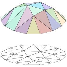 We need to be a set of functions of . In the figure on the right, we have illustrated a triangulation of a 15 sided polygonal region in the plane (below), and a piecewise linear function (above, in color) of this polygon which is linear on each triangle of the triangulation; the space would consist of functions that are linear on each triangle of the chosen triangulation.