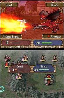 Battles take place on a grid-based battlefield, with objectives which range from clearing enemy groups to capturing points of importance. Each map has unique terrain to be negotiated in battle ranging from mountains to rivers and flat plains. Viewed from an overhead perspective, there are castles and locations such as shops that the player can visit, the latter of which provides a means for obtaining items.[5][8] Each chapter has a different set of victory conditions, which can be related to the number of turns taken or how the enemy force is dealt with.[5] Battles play out using a turn-based system where each unit on both sides is given their chance to move and act. During battle, the combat screen appears, showing the fight from a sidelong perspective. Both sides move at least once, after which the combat screen fades.[5][8] Battles between individual units are governed by the series' recurring Weapons Triangle, a rock–paper–scissors system where certain weapons have advantages over others — lances are stronger than swords, swords are stronger than axes, and axes are stronger than lances.[8] As they participate in battles, each unit gains experience points (EXP) from their actions: they raise their experience level by one when they have accumulated 100 EXP. EXP can be earned in both normal battles and challenge fights in special arenas.[5][8] Players can save at the end of each chapter or outside battle. They also have a single mid-chapter save available.[5][7] All units are subject to permanent death: If a unit dies in battle, they are removed from the rest of the campaign.[5]