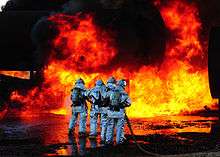 A U.S. Navy firefighter douses a fire during a training drill in July 2008. He is equipped with a fire hose with fog nozzle, breathing apparatus, helmet and full structural firefighting kit. | |