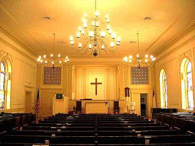 A log church was built near the present day Greeneville Town Hall and the church was renamed Harmony Church. In 1840, the name was changed to Greeneville Presbyterian Church. The present brick building was erected in 1847. During this time, the congregation was the only church between Knoxville and Washington College, an area of approximately 100 miles.[1] In 1928, a fire destroyed the interior of the sanctuary; however, the brick walls were fortunately left intact. In 1940, the name was changed to First Presbyterian Church, as it exists today.
